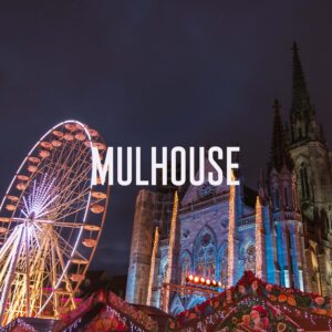 À Mulhouse, le marché de Noël, situé sur la place de la Réunion, se distingue par son hommage à la tradition textile de la ville. Chaque année, un tissu exclusif est créé pour habiller les chalets et les illuminations.